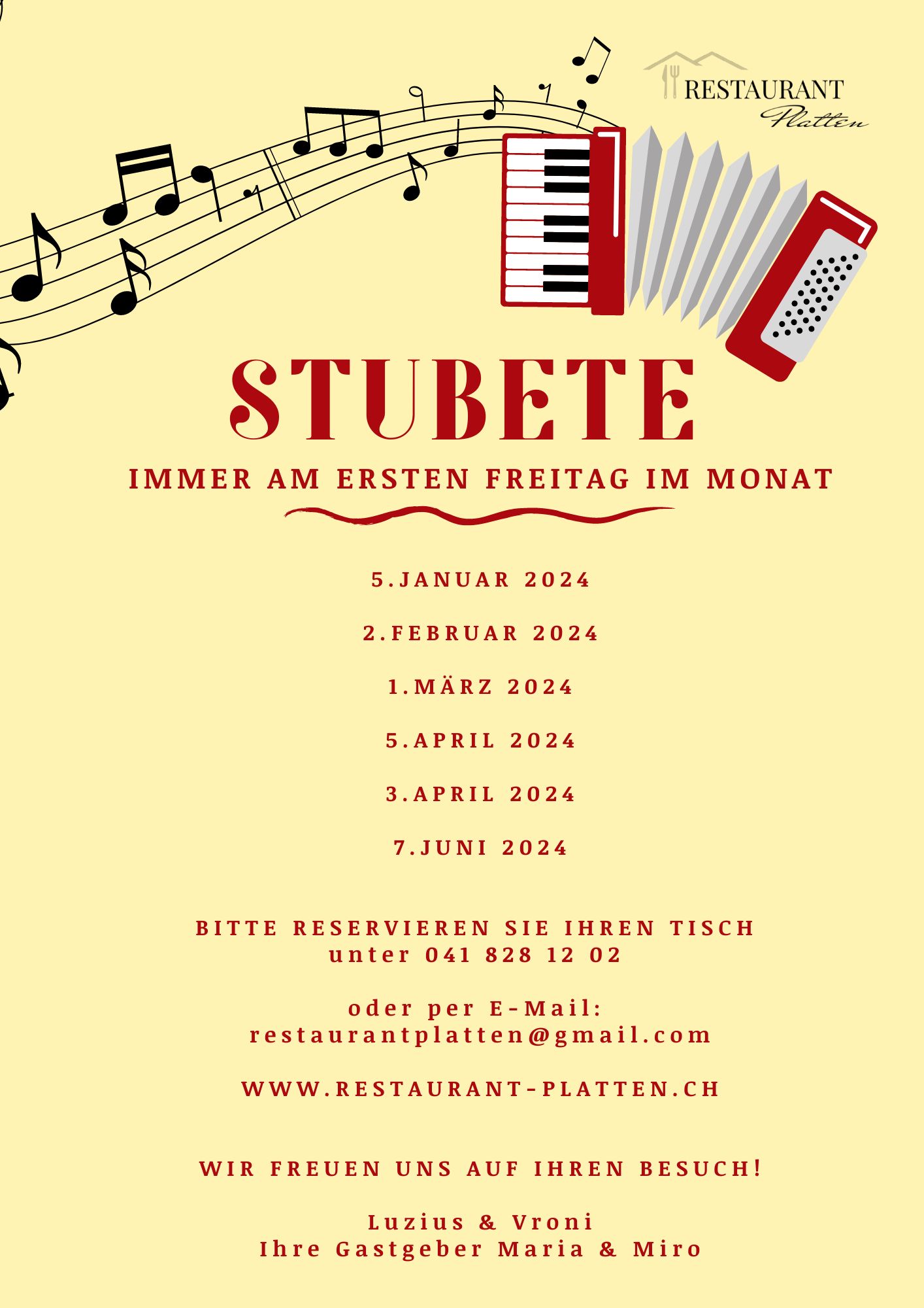 Startseite » Musik » Stubete im Restaurant Platten Musik Stubete im Restaurant Platten Maria Molitoris 02/05/2024 105 Aufrufe 0 Stubete mit Luzius & Vroni Immer am ersten Freitag im Monat